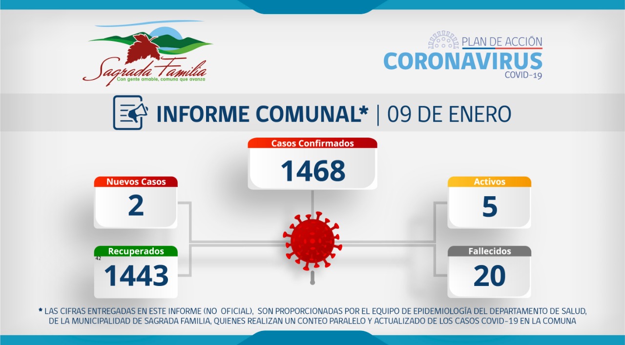 La Municipalidad de Sagrada Familia en conjunto con el Departamento de Salud a través de su equipo epidemiológico, da a conocer informe (no oficial) sobre Coronavirus en la comuna, actualizado al día de hoy, de acuerdo a estadística interna.