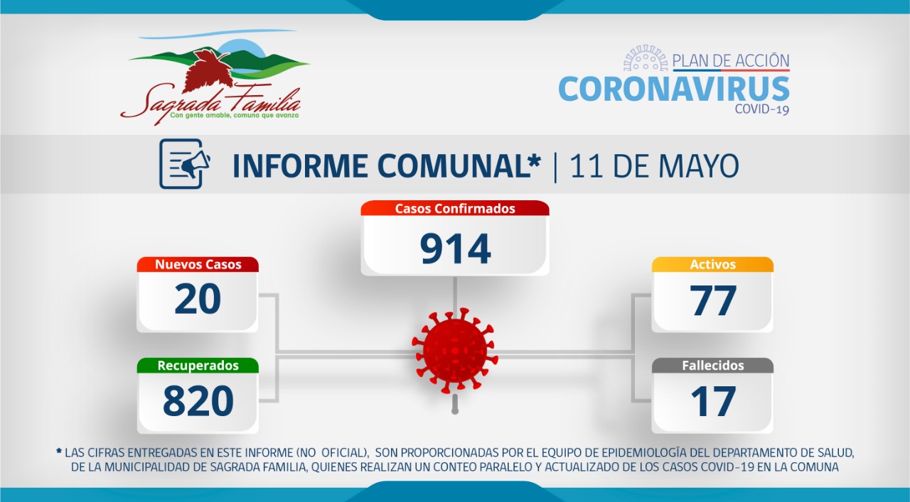 La Municipalidad de Sagrada Familia en conjunto con el Departamento de Salud a través de su equipo epidemiológico, da a conocer informe (no oficial) sobre Coronavirus en la comuna, actualizado al día de hoy, de acuerdo a estadística interna.