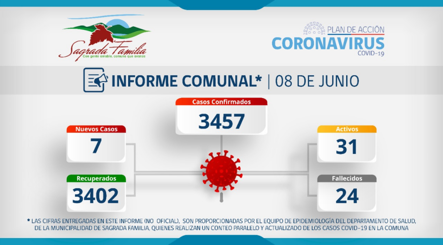 La Municipalidad de Sagrada Familia en conjunto con el Departamento de Salud a través de su equipo epidemiológico, da a conocer informe (no oficial) sobre Coronavirus en la comuna, actualizado al día de hoy, de acuerdo a estadística interna.