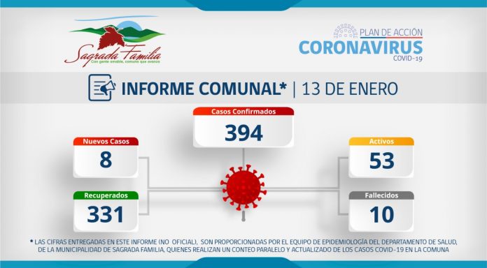 La Municipalidad de Sagrada Familia en conjunto con el Departamento de Salud a través de su equipo epidemiológico, da a conocer informe (no oficial) sobre Coronavirus en la comuna, actualizado al día de hoy, de acuerdo a estadística interna.