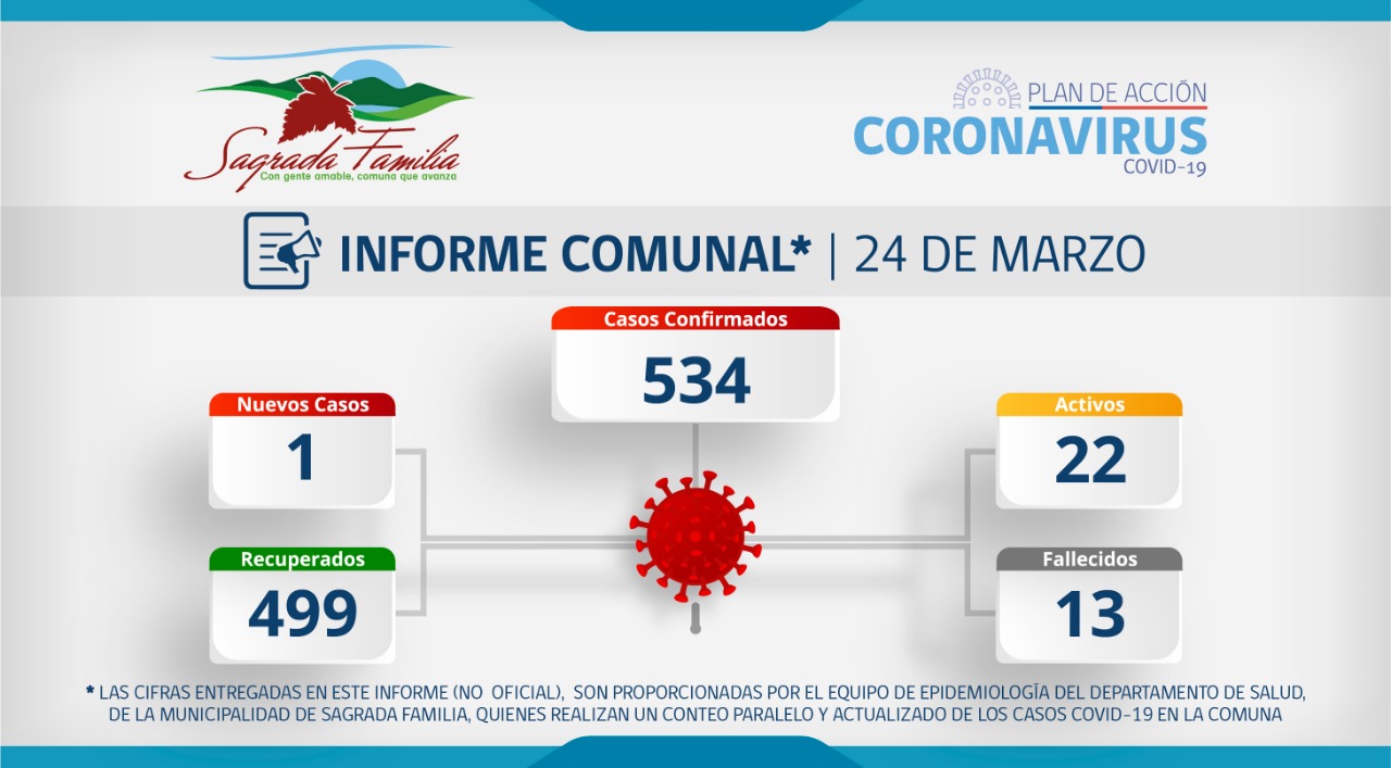 La Municipalidad de Sagrada Familia en conjunto con el Departamento de Salud a través de su equipo epidemiológico, da a conocer informe (no oficial) sobre Coronavirus en la comuna, actualizado al día de hoy, de acuerdo a estadística interna.