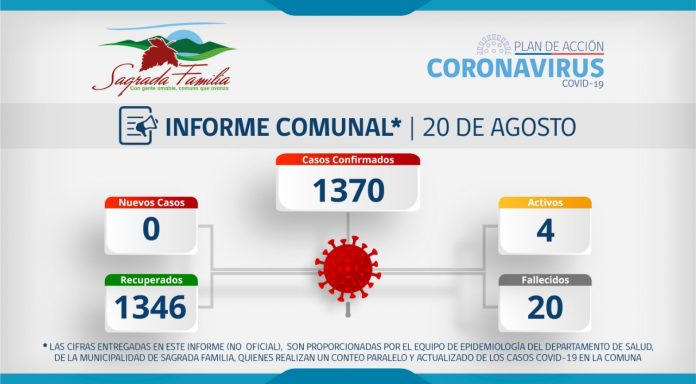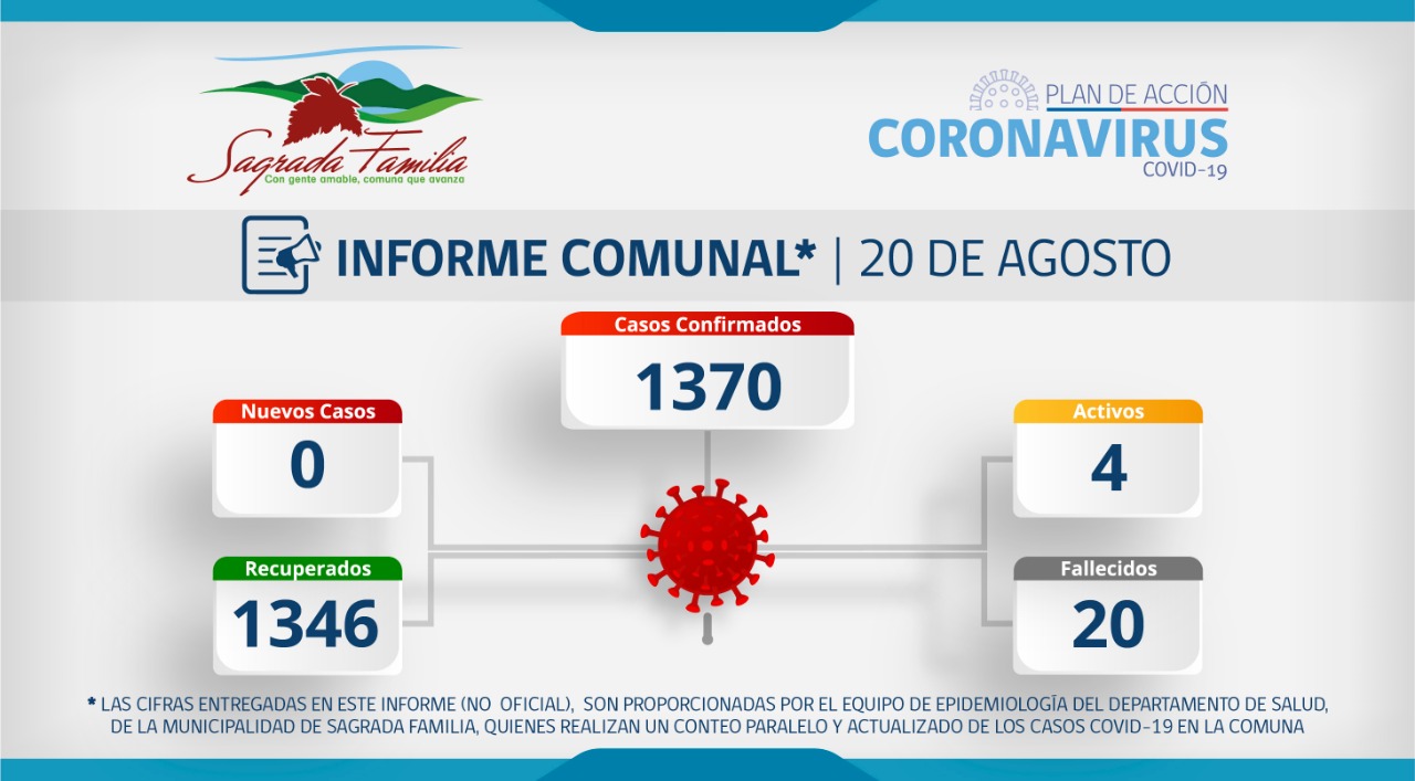 La Municipalidad de Sagrada Familia en conjunto con el Departamento de Salud a través de su equipo epidemiológico, da a conocer informe (no oficial) sobre Coronavirus en la comuna, actualizado al día de hoy, de acuerdo a estadística interna.